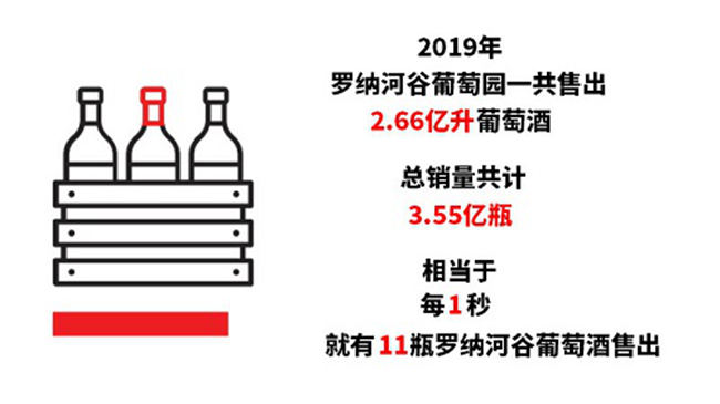 2019年,罗纳河谷葡萄园一共售出2.66亿升葡萄酒,总销量共计3.55亿瓶。这样计算下来,在2019年里的每一秒,都有11瓶罗纳河谷葡萄酒售出,消费者对罗纳河谷葡萄酒的喜爱与信赖可见一斑。