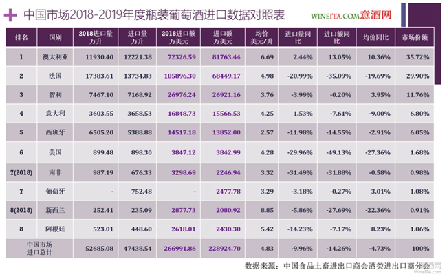 为了更好的对照数据,我们将2018年度瓶装葡萄酒进口额排名前八的供应国数据也放进2019年瓶装葡萄酒进口数据中。从对照表可以看出,2019年度中国进口瓶装葡萄酒总量为47438.54万升,瓶装葡萄酒进口总额为22.8924亿美元,相比2018年分别下降9.96%和14.26%。瓶装葡萄酒进口均价为4.83美元/升,相比2018年下降了4.73%。
