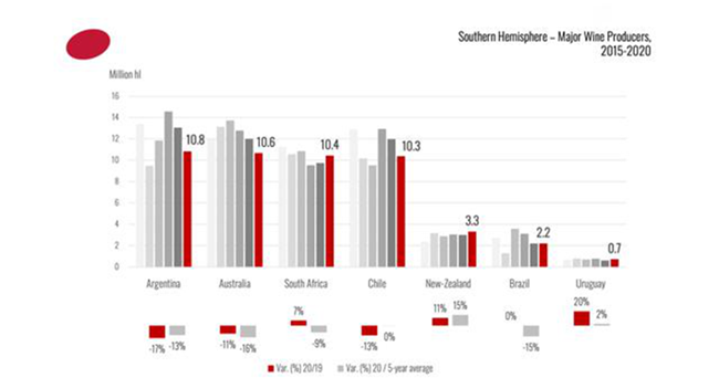 2020年,南半球的产量为49 亿升(mhl),为过去15年的最低水平,仍占全球葡萄酒产量的21%。