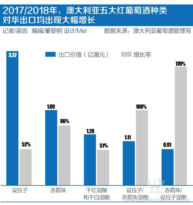 2017/2018年,澳大利亚五大红葡萄酒种类对华出口均出现大幅增长。设拉子增长52%至3.37亿澳元,赤霞珠增长86%至1.89亿澳元,干红混酿和干白混酿增长51%至1.28亿澳元,设拉子/赤霞珠混酿增长108%至1.11亿澳元,赤霞珠/设拉子混酿增长170%至9100万澳元。